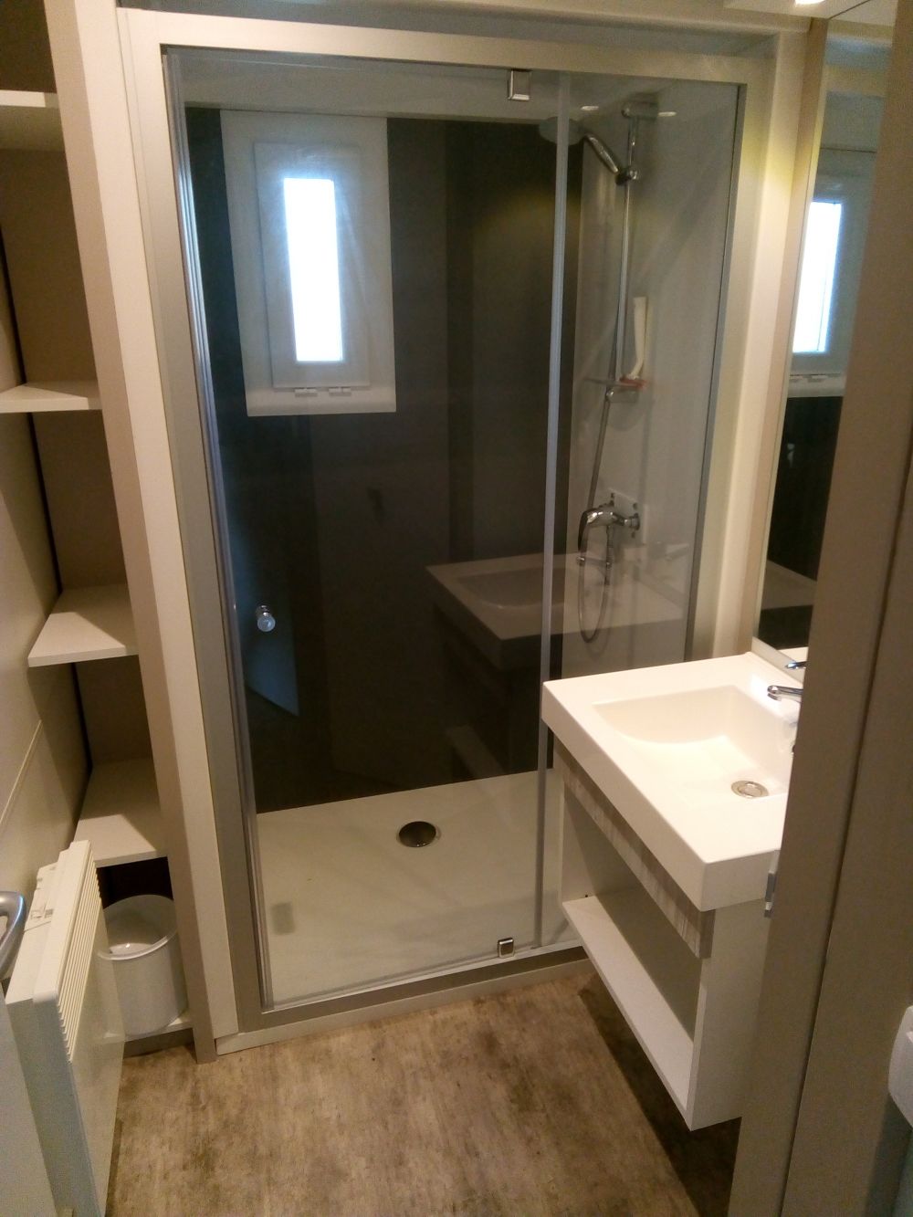 Une salle d'eau avec douche, lavabo avec eau chaude et étagères de rangement. WC séparés